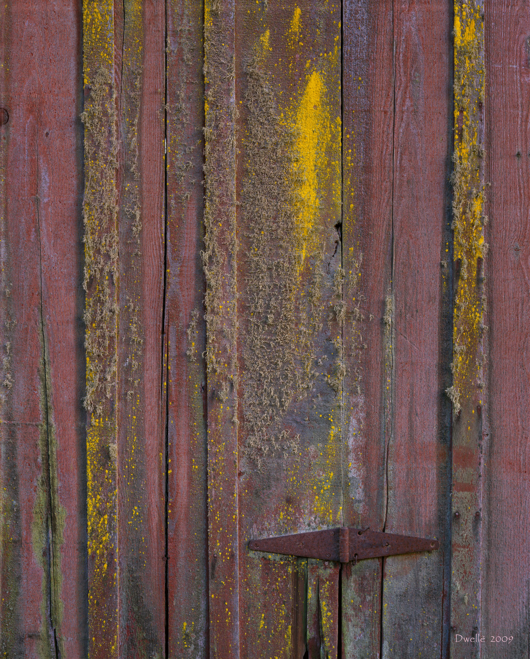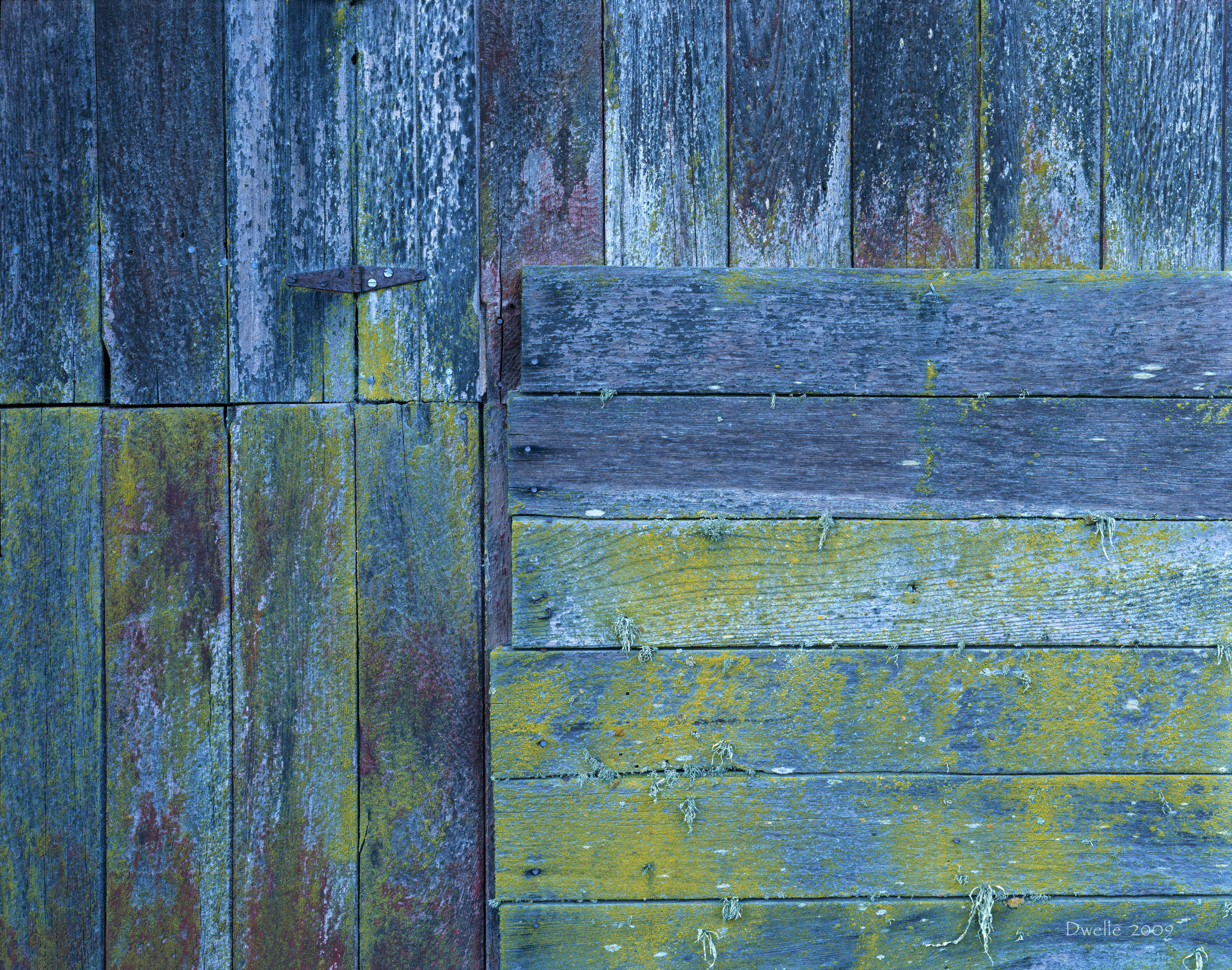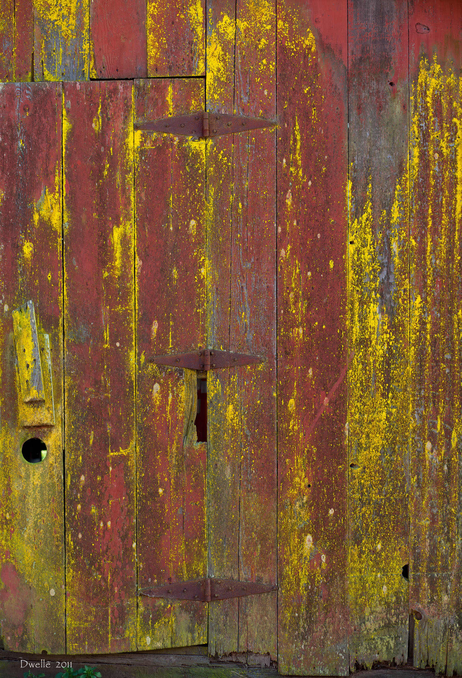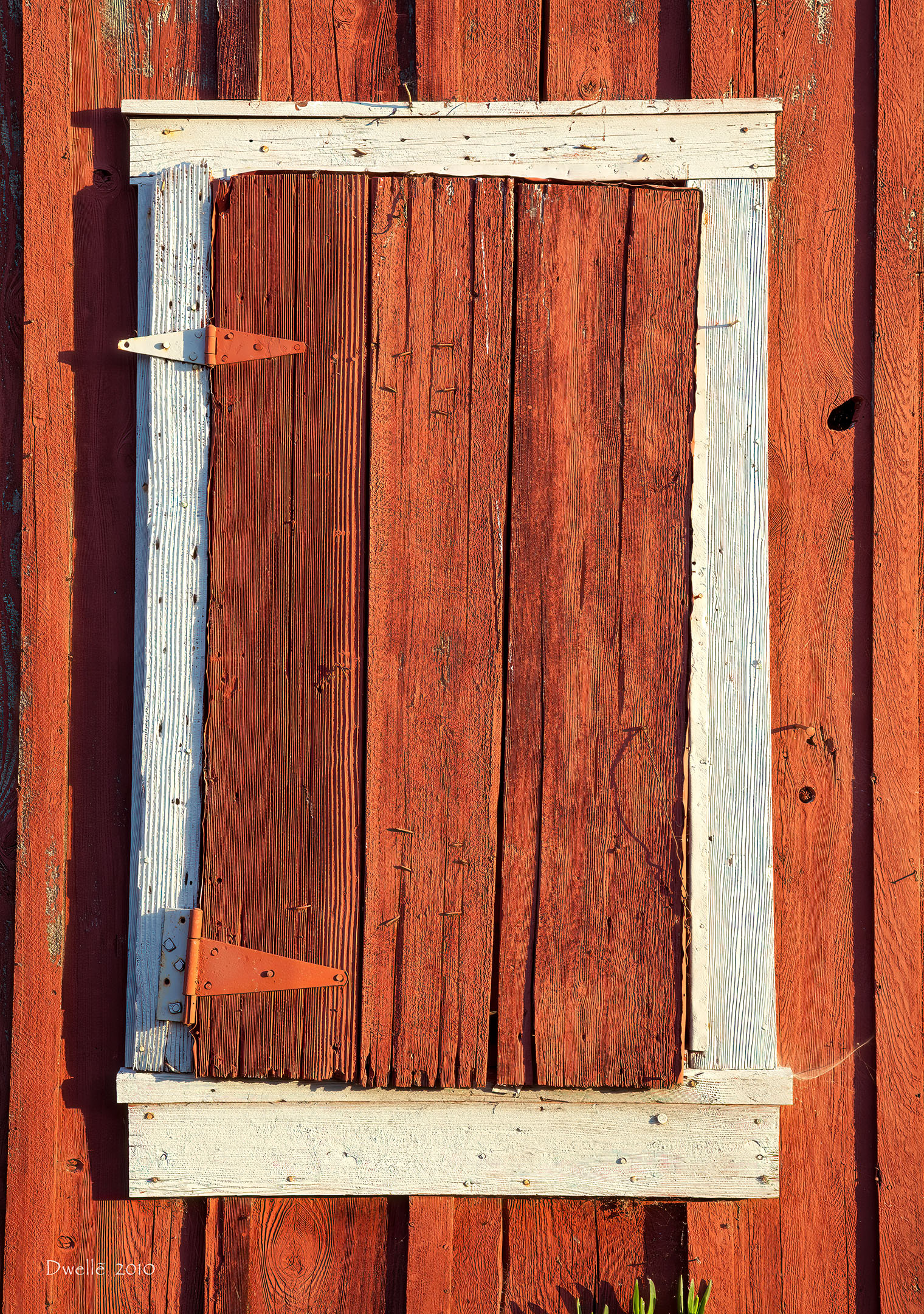 These details were hiding from the light of noon in a narrow gap between two farm buildings. Notice the "owl" hiding in the knot by the hinge.