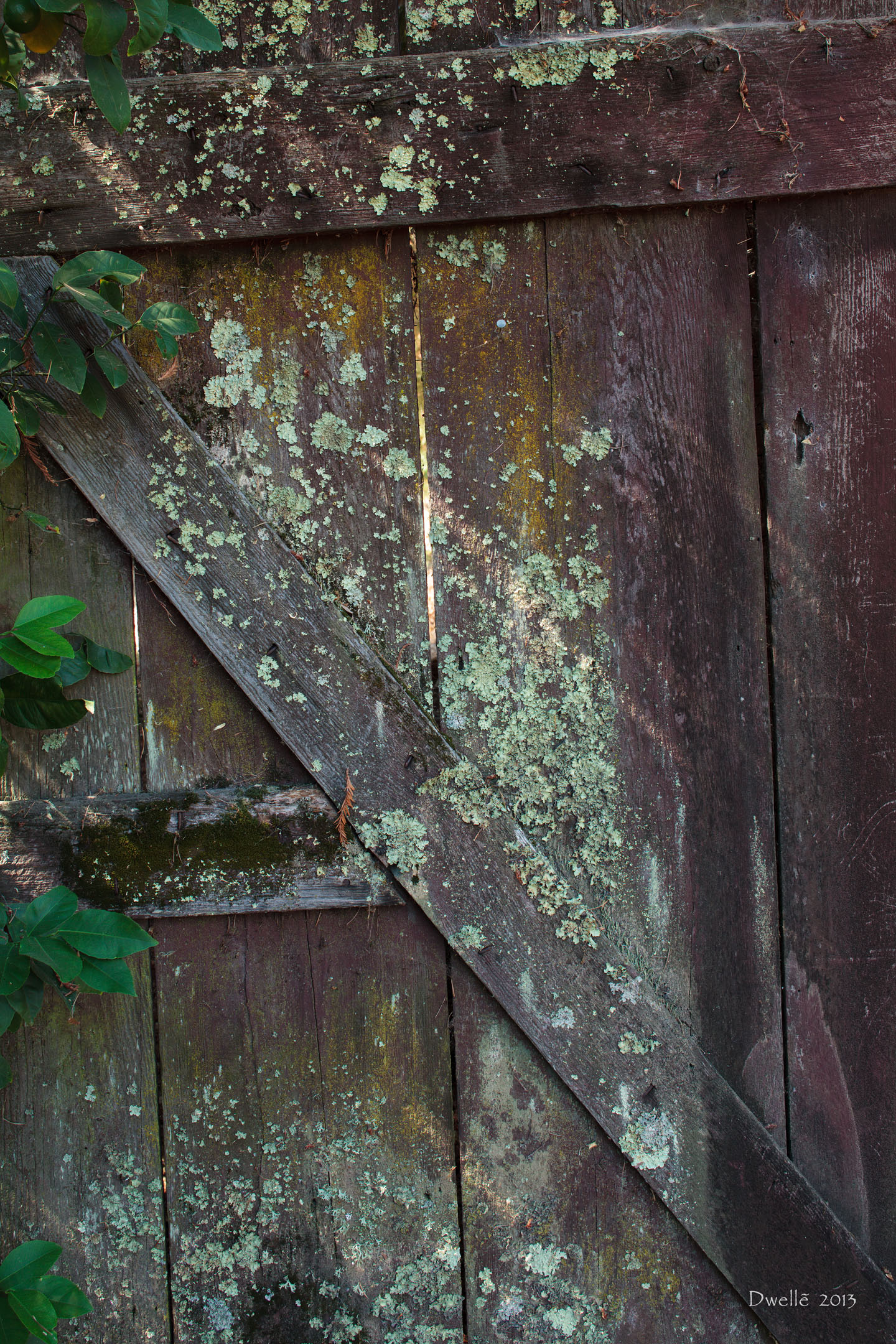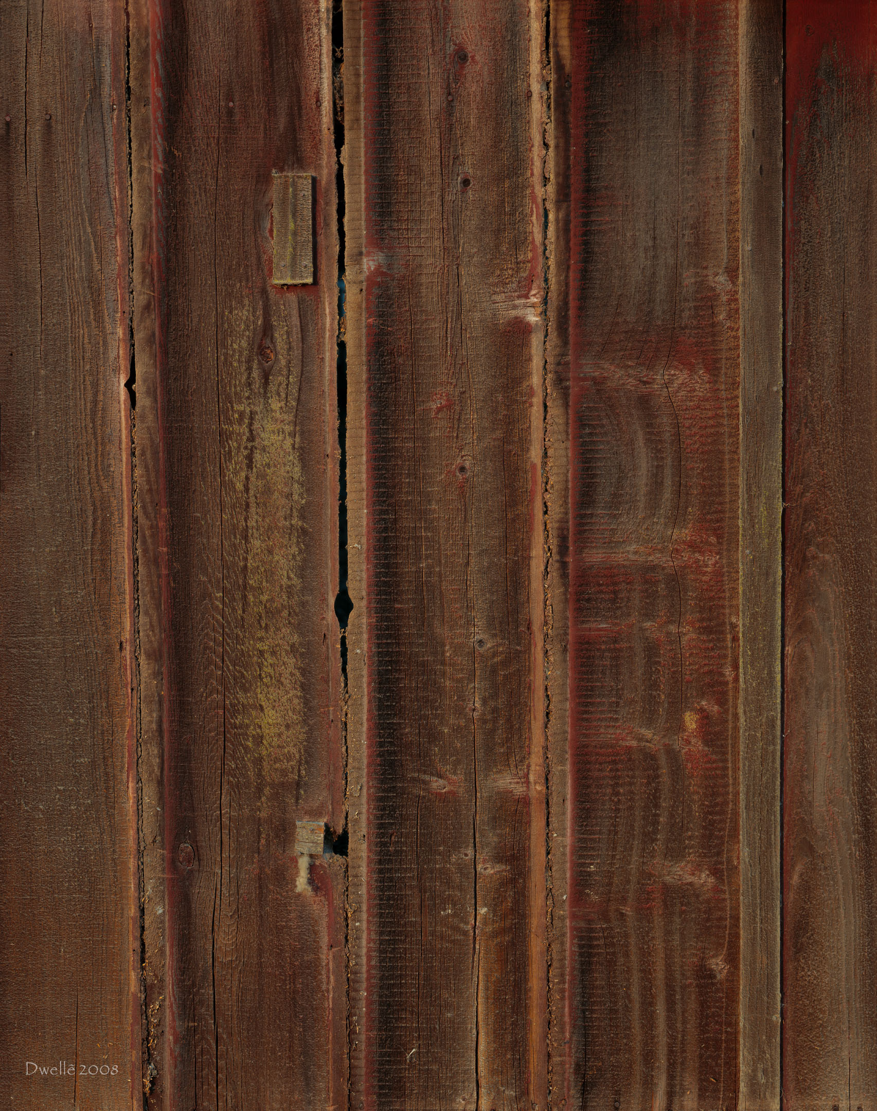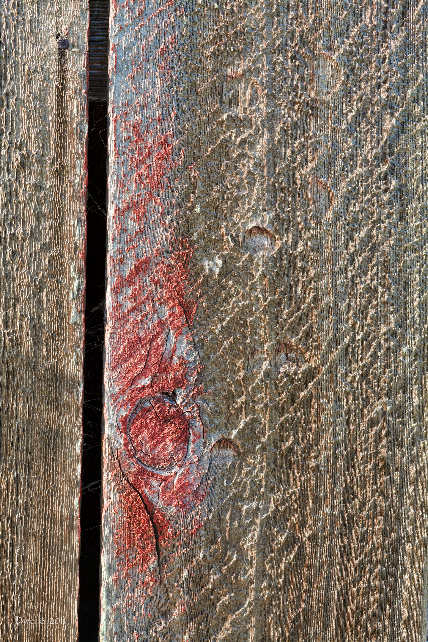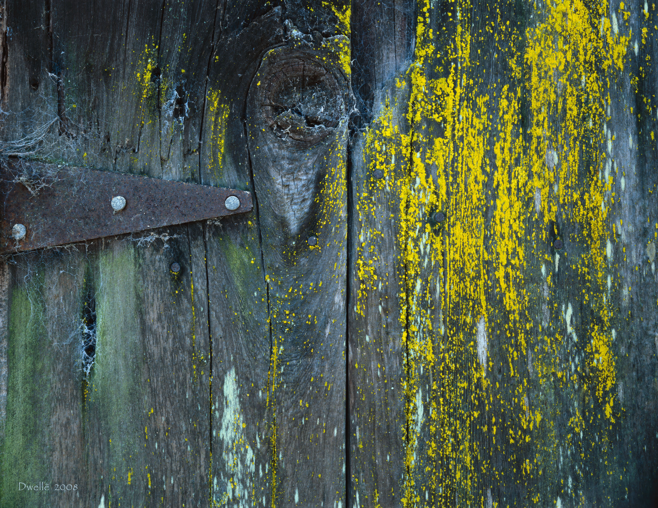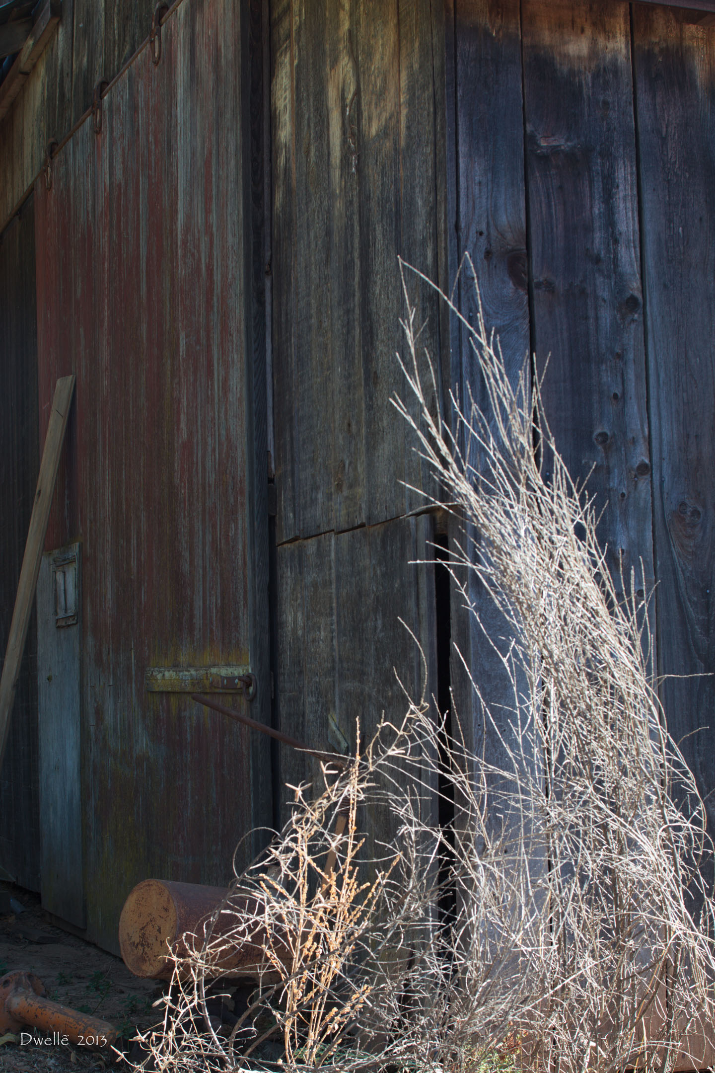 These details were hiding from the light of noon in a narrow gap between two farm buildings. Notice the "owl" hiding in the knot by the hinge.