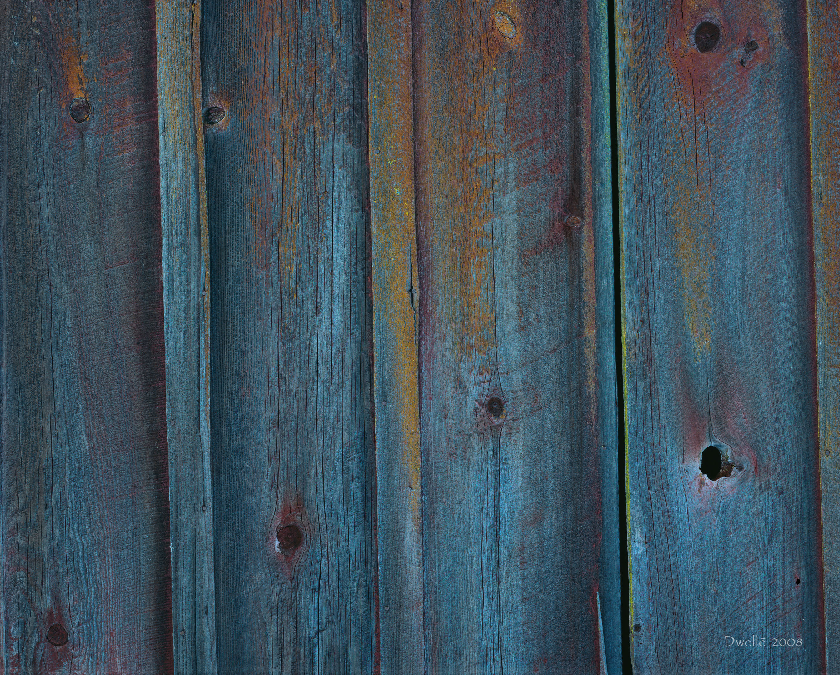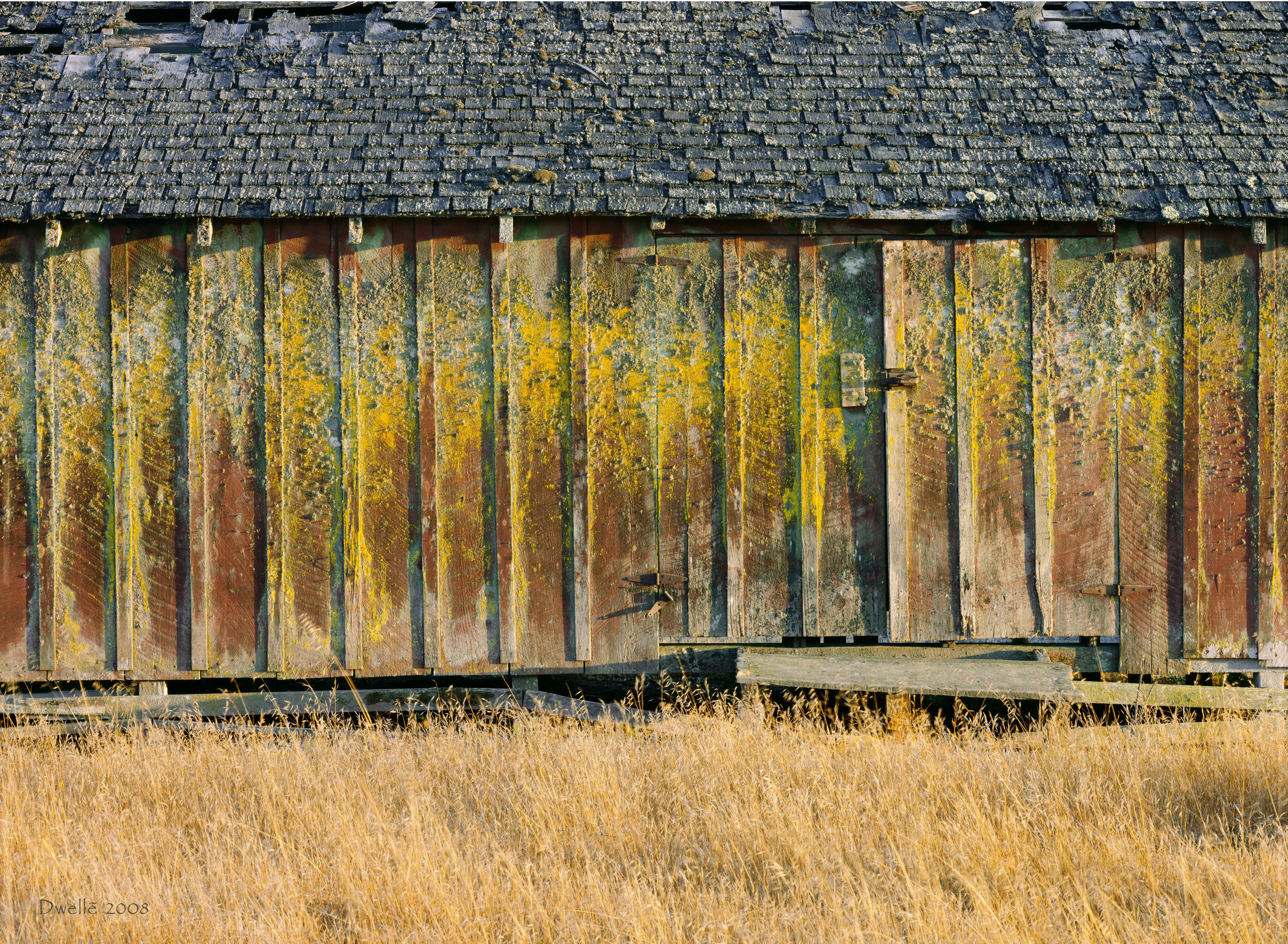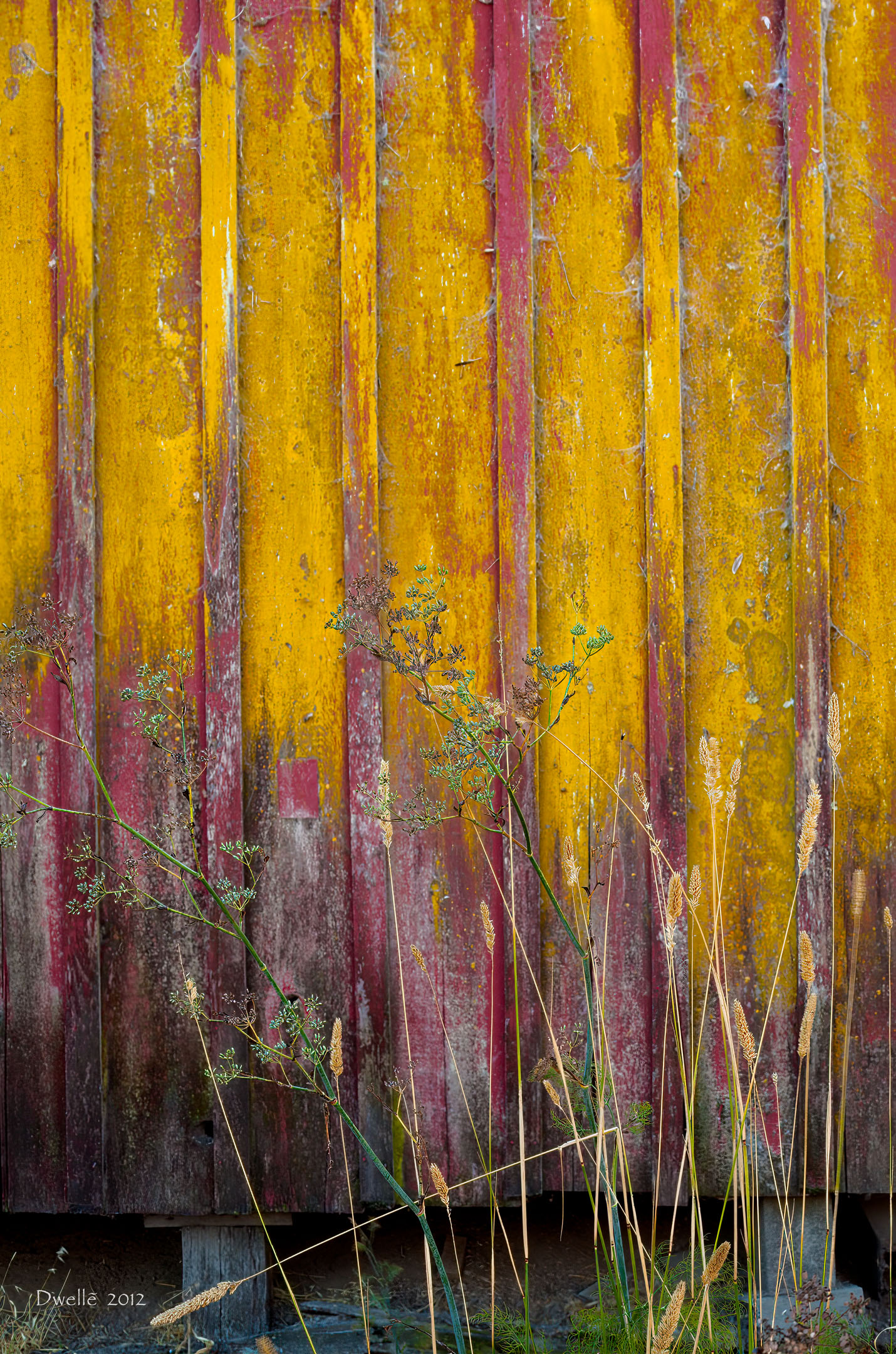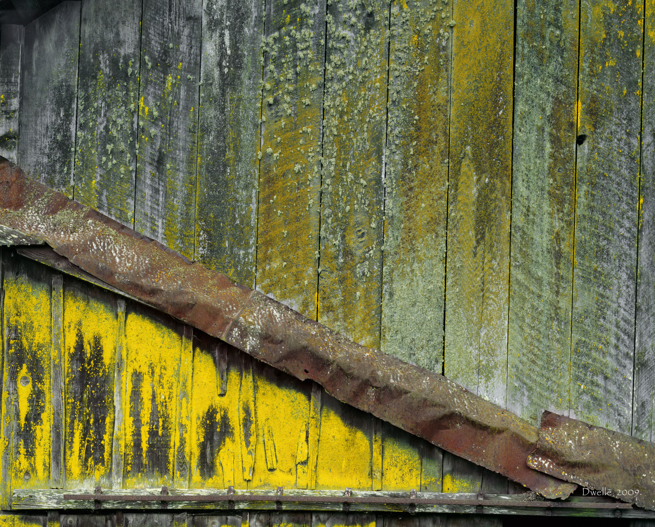 Once your eyes recover from the dazzle of "unnatural" yellows, greens, oranges you realize that all colors belong to nature. Now look for the circular saw marks on the upper planks. Now do wyou see the straight-accross band saw marks on the lower remains of an attached shed? Clearly these planks were sawn in different eras.