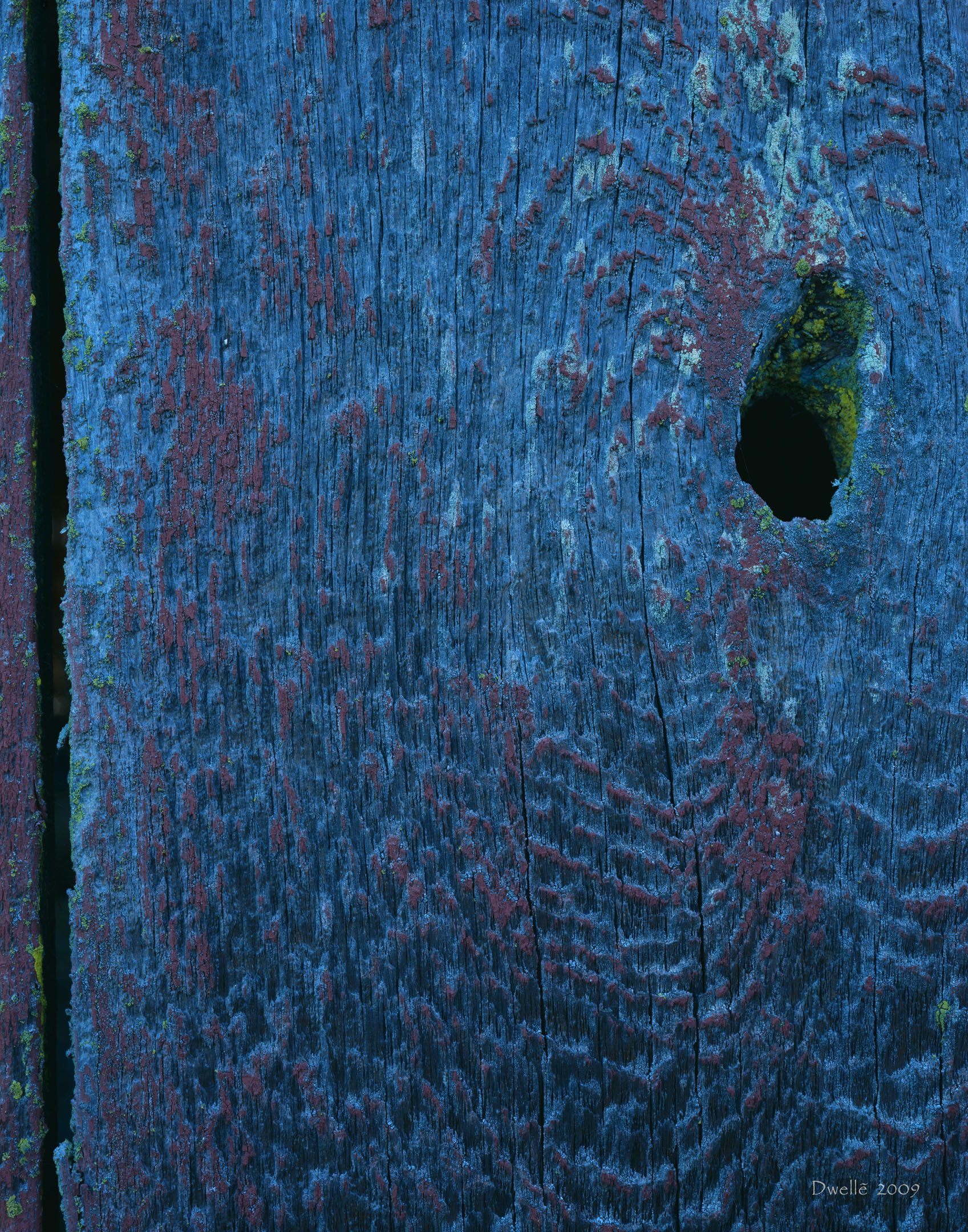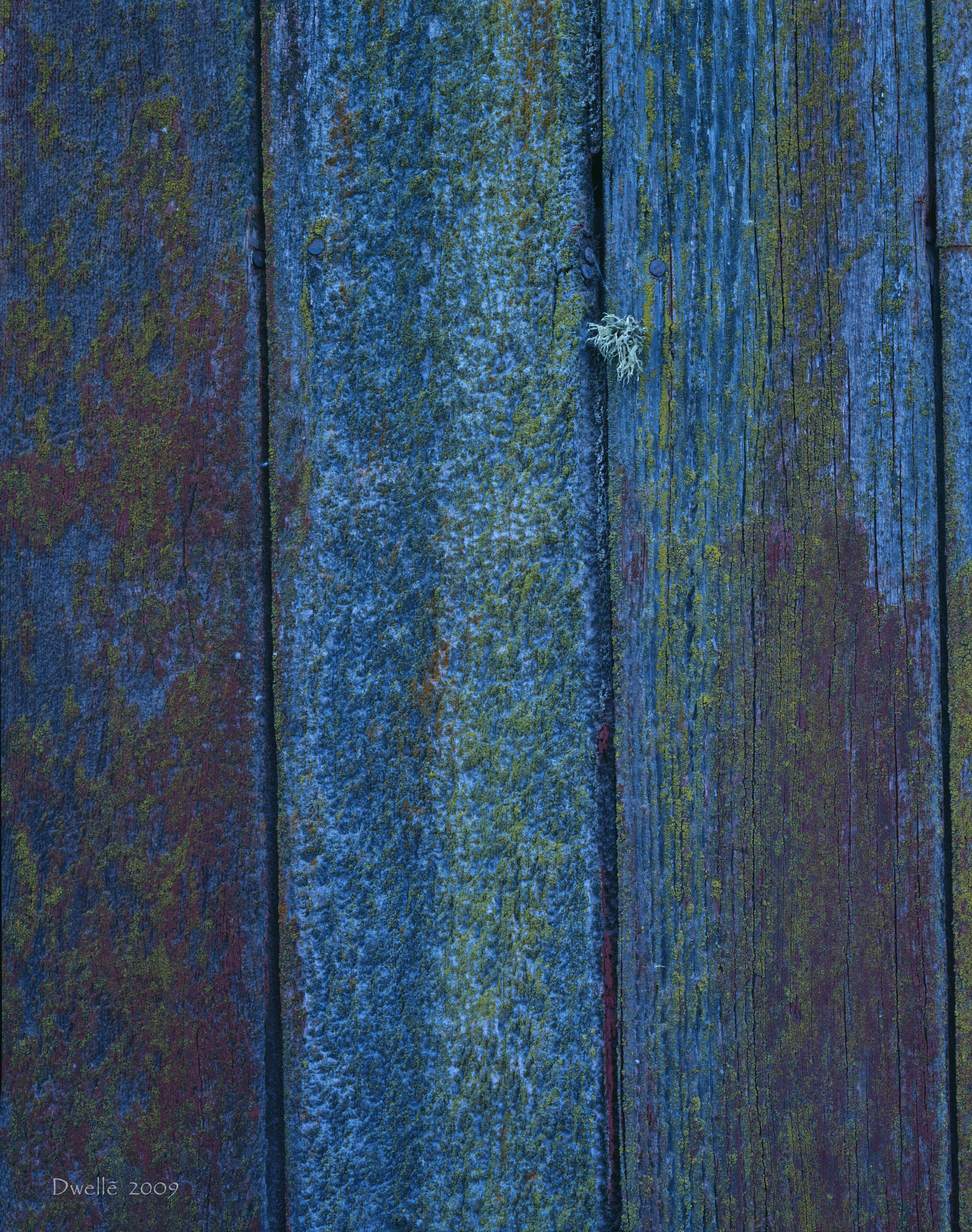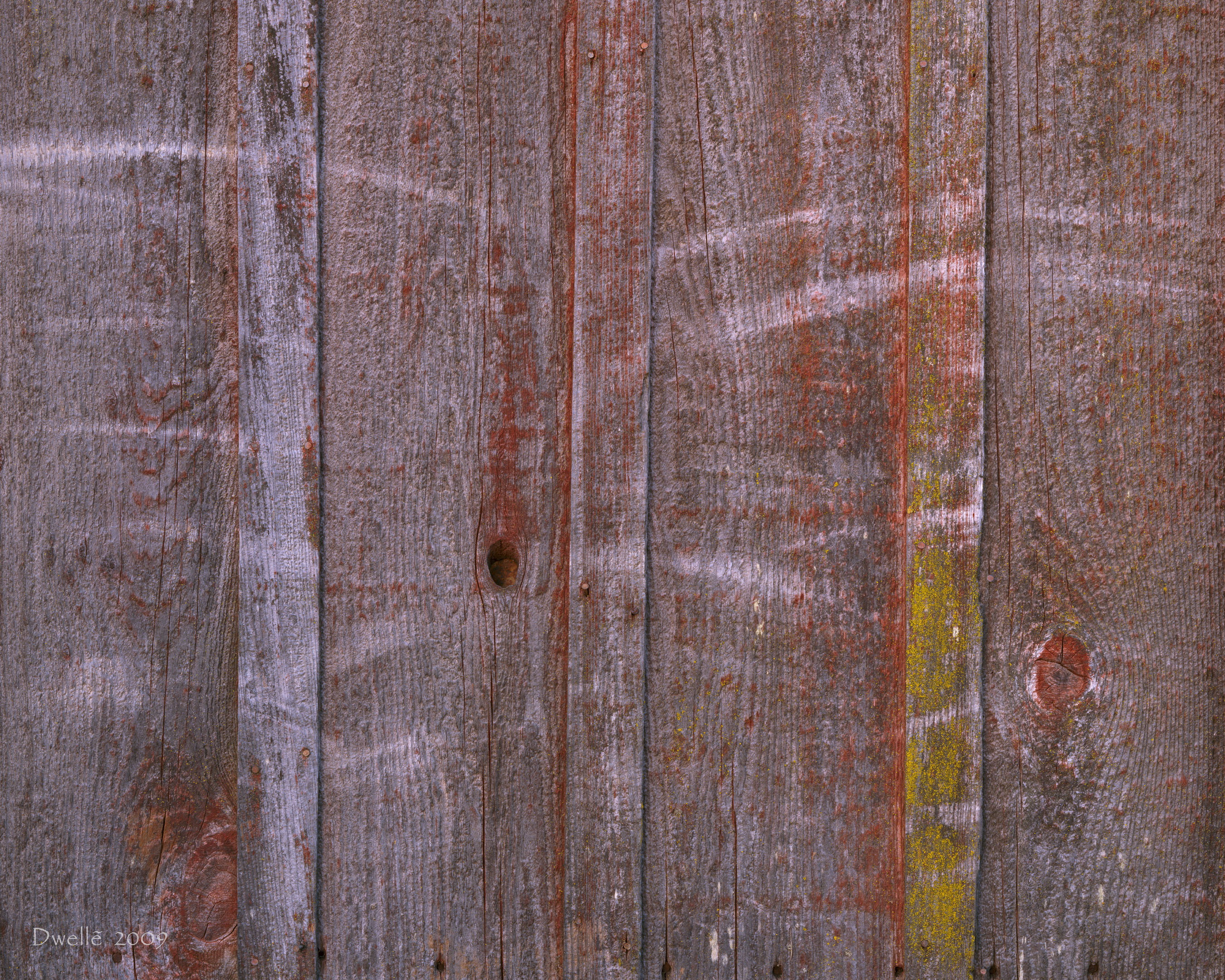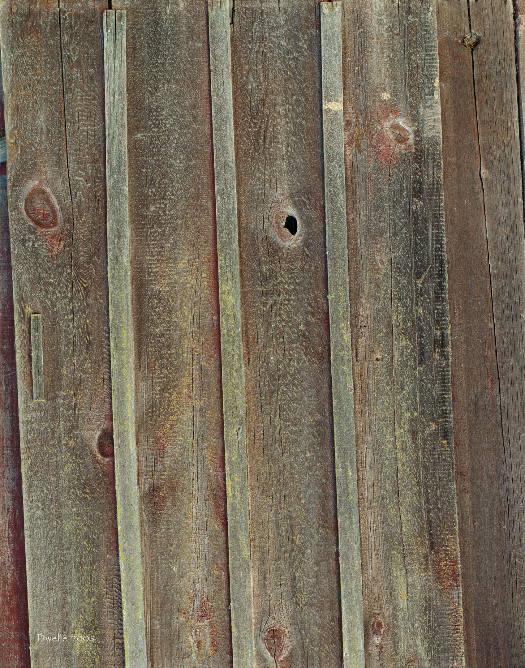 Once your eyes recover from the dazzle of "unnatural" yellows, greens, oranges you realize that all colors belong to nature. Now look for the circular saw marks on the upper planks. Now do wyou see the straight-accross band saw marks on the lower remains of an attached shed? Clearly these planks were sawn in different eras.