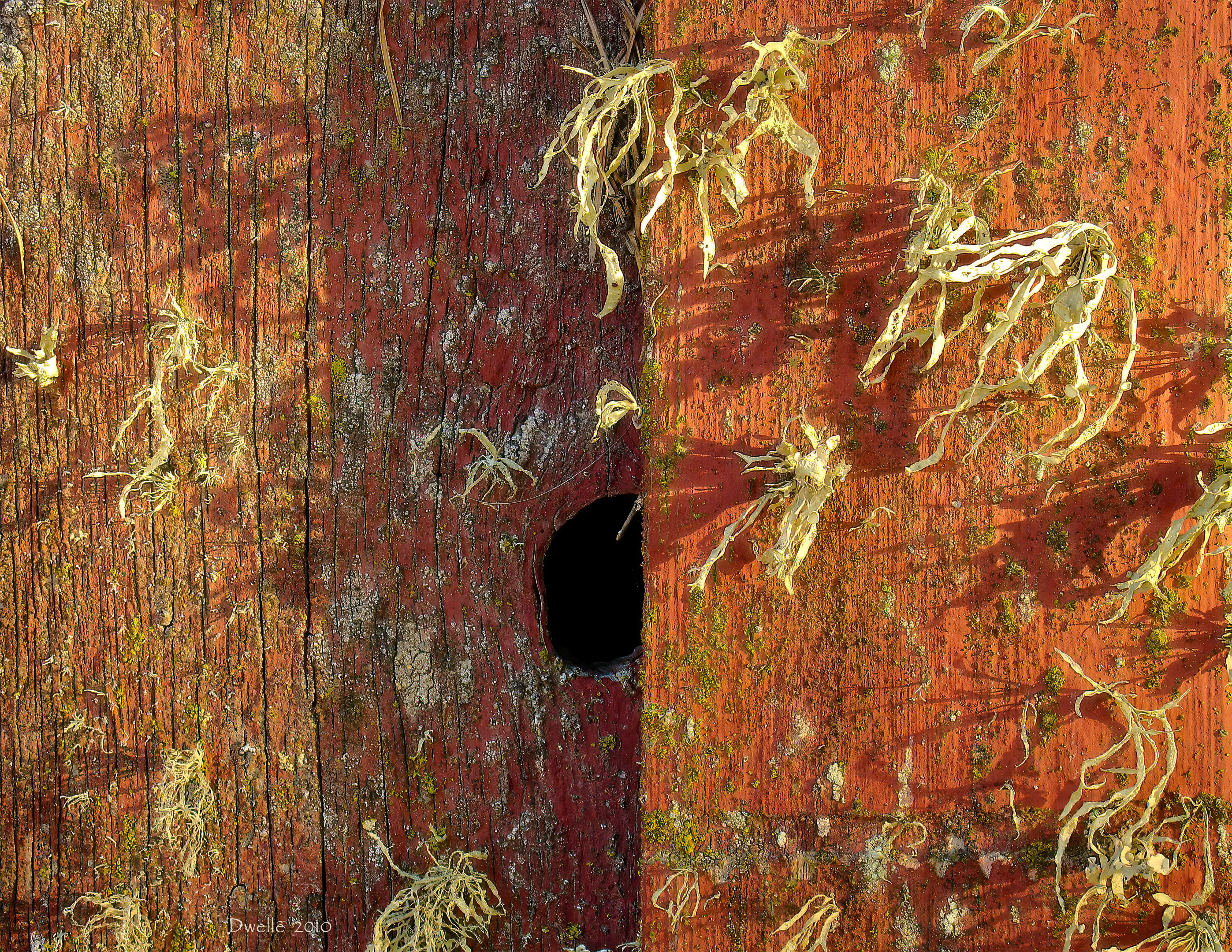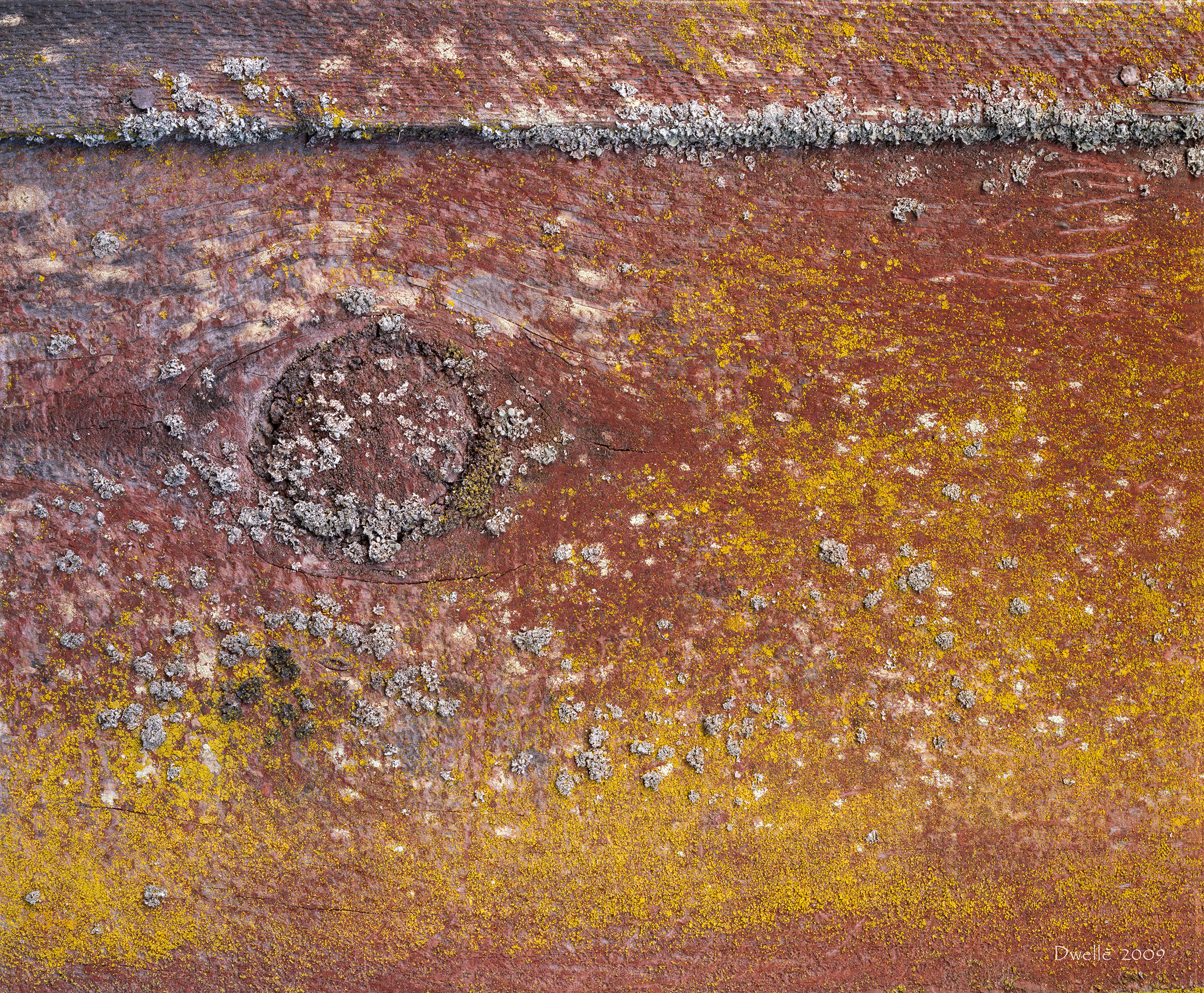Is it red paint under yellow lichen or the other way around? Van Gogh could have left this scene while wiping his brushes dry from one of his signature hay stack paintings. But the artist here was merely time facing north in a damp hay field