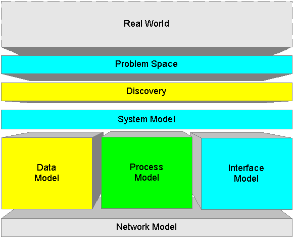 This diagram shows how information systems models fit together to represent some arbitrary piece of the real world. Each shape is a clikable link to further discussion about its respective topic.
