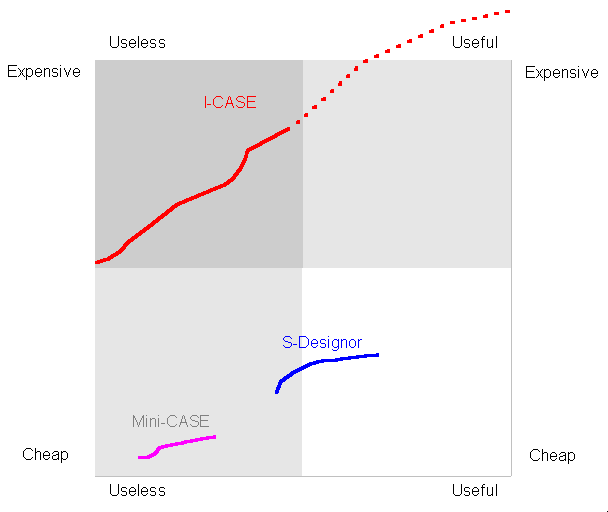 In the diagrams below, we consider the "death" of CASE, meaning large-scale integrated CASE, versus the recent flowering of small-scale case component tools such as PowerDesigner. Were the I-CASE tools just too ambitious?
