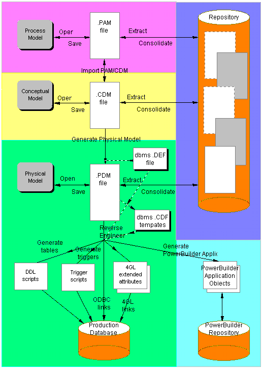 This diagram shows how the product modules of PowerDesigner are integrated with each other and with the external target databases.