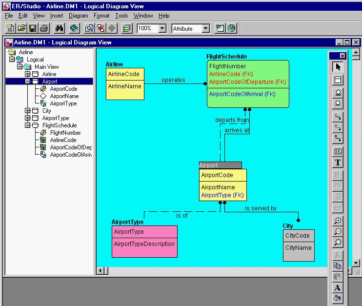 for nearly every modeling task. Carrying on with Win95 GUI style, ER/Studio splits each MDI model window into a tree browser on the left and the diagram itself on the right. Since the divider between is movable, one need not fear loosing precious diagram space to unwanted accessories (at least not on my 21" monitors). But the tree will hardly be unwanted; in fact it's very useful, practically indispensable. Since the tree lists each diagram (logical and physical, complete or sub-view) in a model, you can instantly scan and activate any diagram from the tree. In the same fashion, if you expand the listing for a diagram, all its entities (or tables in the physical) are listed. Notice in the screen shot above that I've selected Airport in the tree. It is simultaneously selected in the diagram and its attributes are expanded in the tree list. Neat, intuitive, and very useful. Another unique and powerful navigation feature is the Zoom Window - a small resizable window floating on top which acts as a dynamic magnifying glass for the diagram region under the cursor. When Embarcadero adds in-place editing (full on-screen editing of entity and attribute names is included in V2.5) this will be absolutely tops among ER tools for object definition. Naturally a double-click on any object brings up its appropriate property dialog. These make good use (improving steadily) of tabs to reveal all categories of content on a single plane, minimizing the dreaded nested dialog syndrome. ER/Studio challenges the historic leader in graphic manipulation - PowerDesigner - for first place honors in speed and smoothness of zoom, scroll, and move. These may seem trivial but if you are staring at the monitor all day, those half-seconds waiting for a zoom really add up and wear you out. |