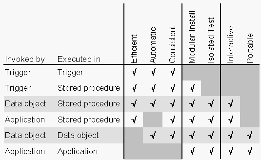 he table below summarizes several approaches to packaging data access and control logic, contrasting their strengths and weaknesses